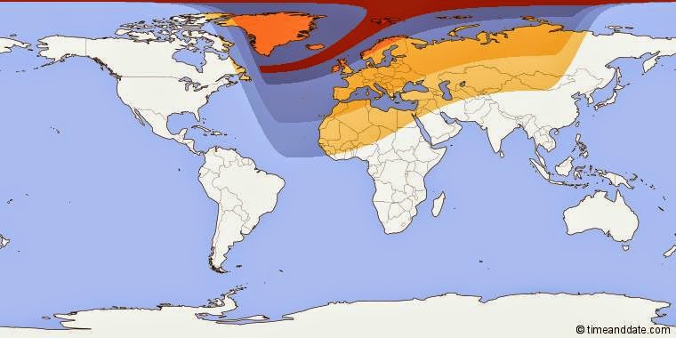 A much larger swath of the world gets to see varying degrees of a partial solar eclipse (Greenland, Iceland, Europe, northern Africa, the Middle East and northwestern Asia).
